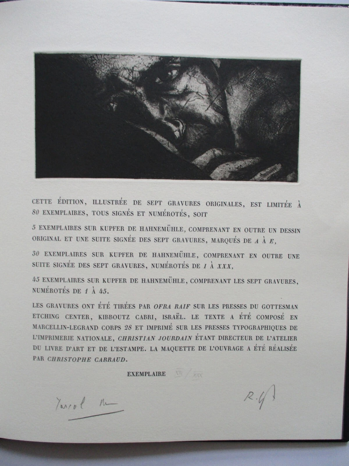 Les gravures ont été tirées par Ofra Raif sur les presses du Gottesman Etching Center, Kibboutz Cabri, Israël. Le texte a été composé en Marcellin-Legrand corps 28 et imprimé sur les presses typographiques de l'Imprimerie nationale, Christian Jourdain étant directeur de l'atelier du livre d'art et de l'estampe. La maquette de l'ouvrage a été réalisée par Christophe Carraud.